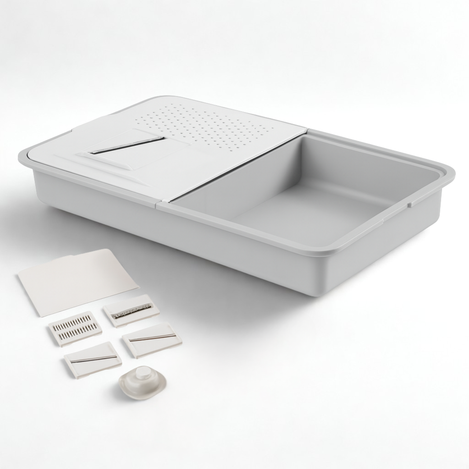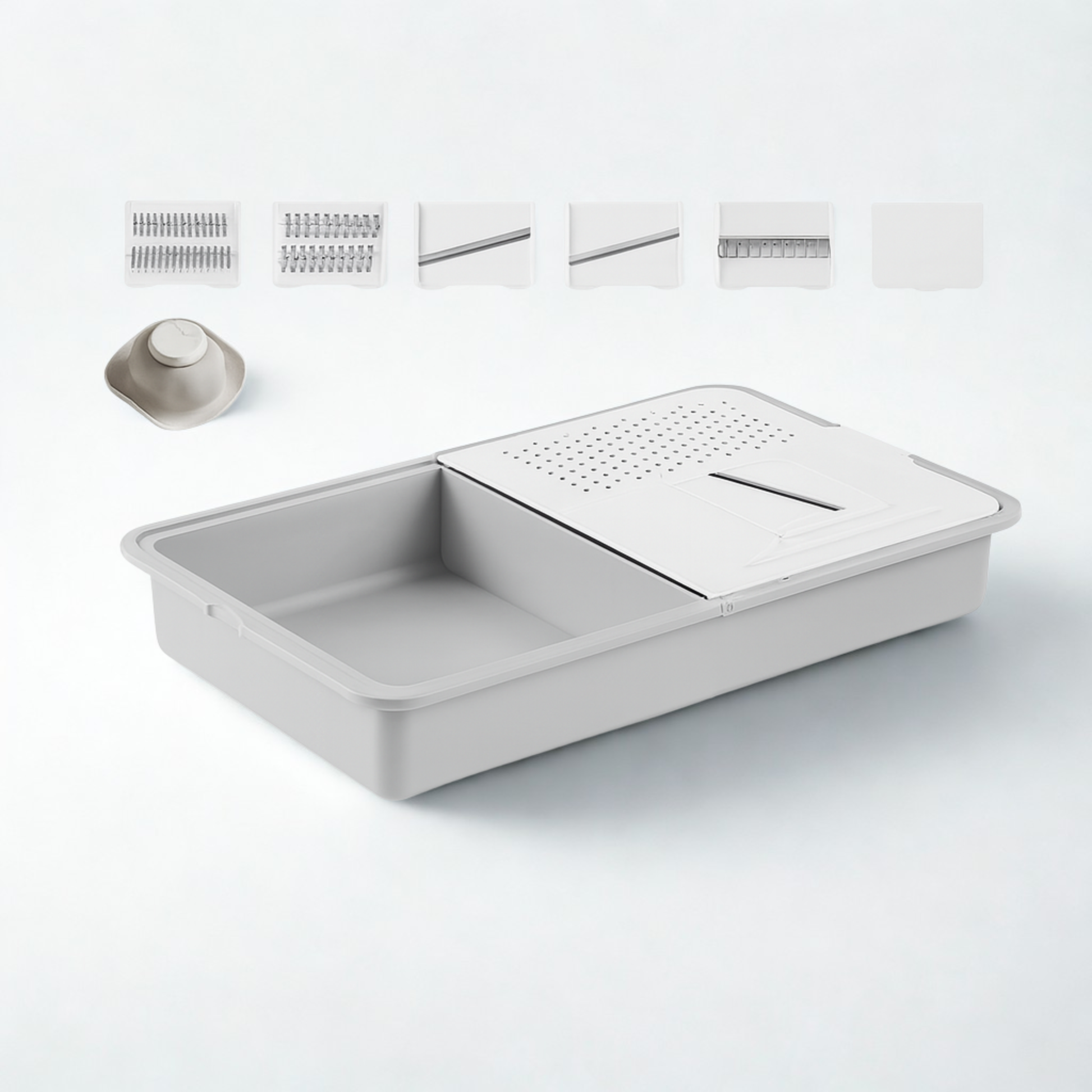 ✅ 8-Piece All-in-One Set – Includes interchangeable stainless-steel blades for slicing, shredding, and grating; a drain basket; a safety hand guard; and a built-in cutting board with storage container.